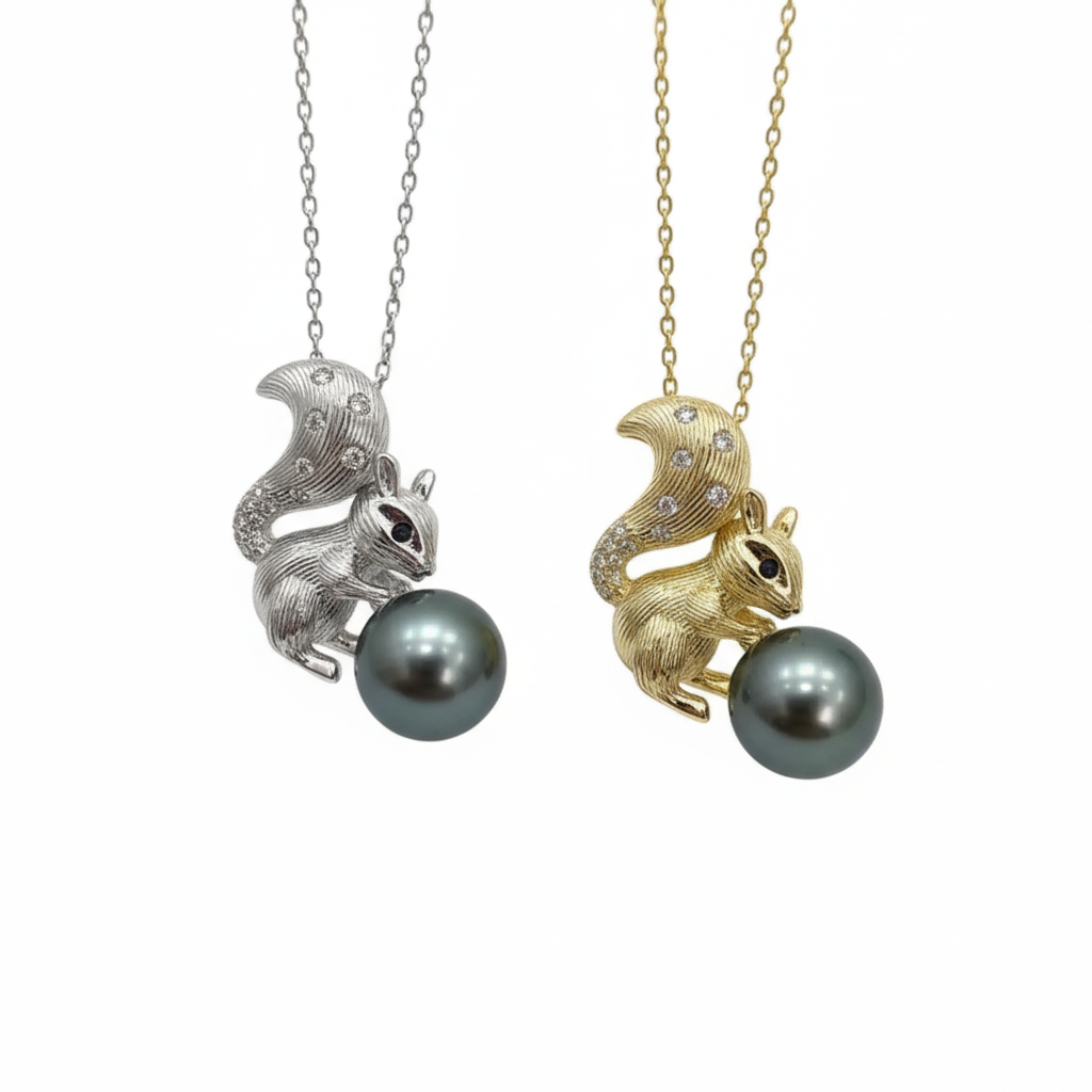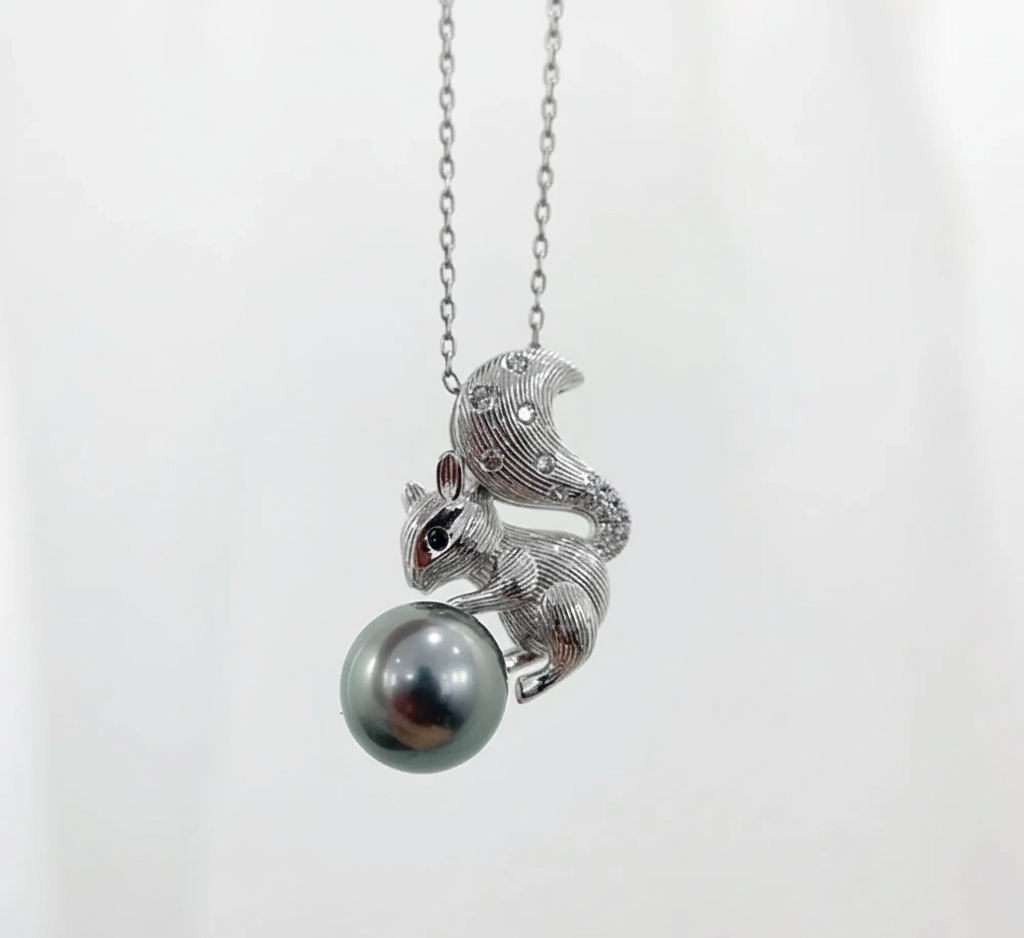 Le symbole d’un luxe inégalé avec notre collier raffiné avec pendentif écureuil de perle de Tahiti 9-10 mm